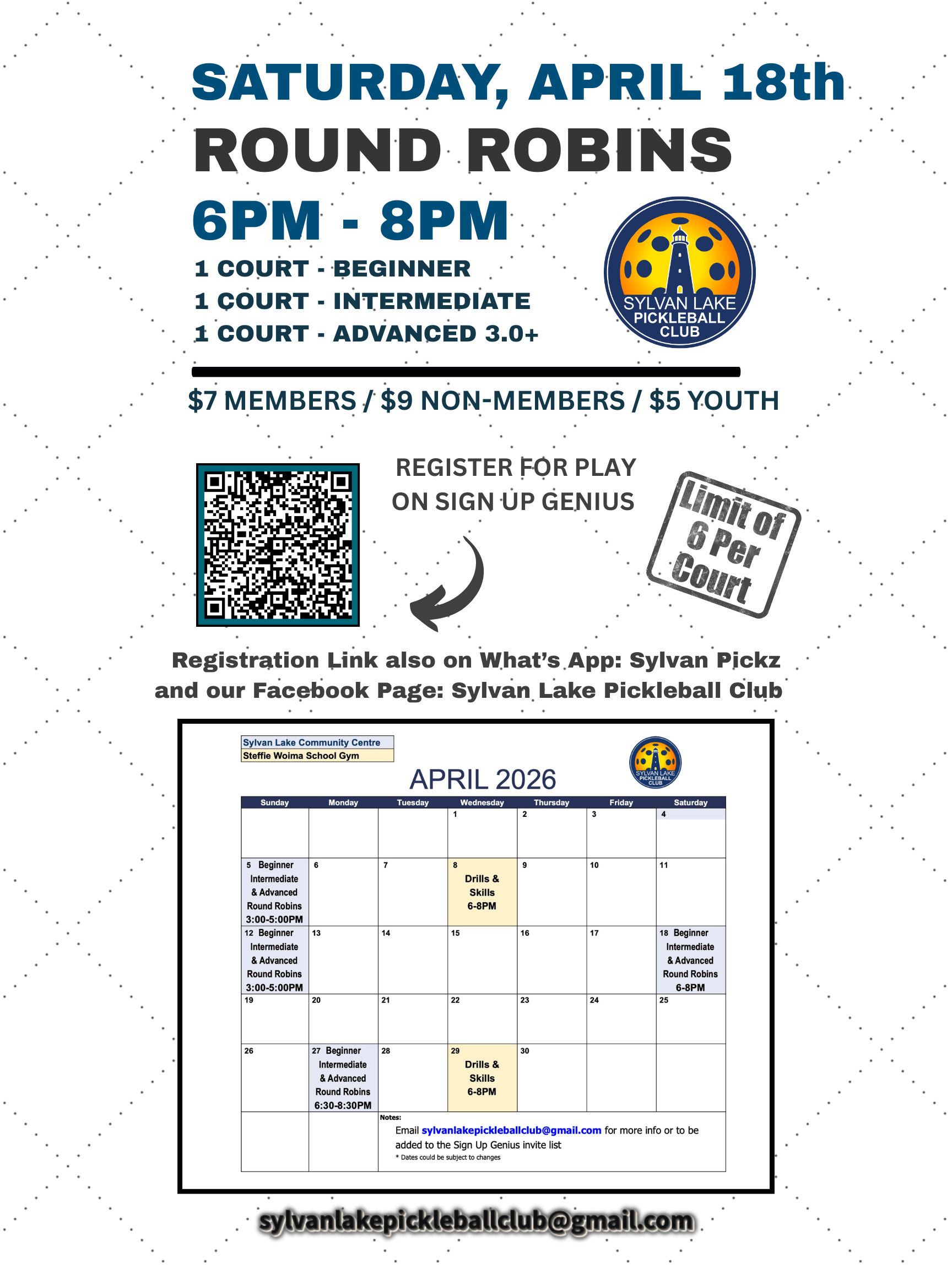 The Sylvan Lake Pickleball Club is excited to welcome you to a variety of organized play. We run Intro To Pickleball sessions, Drills & Skills, Beginner/Novice/Intermediate Round Robins, as well as Open Round Robins.