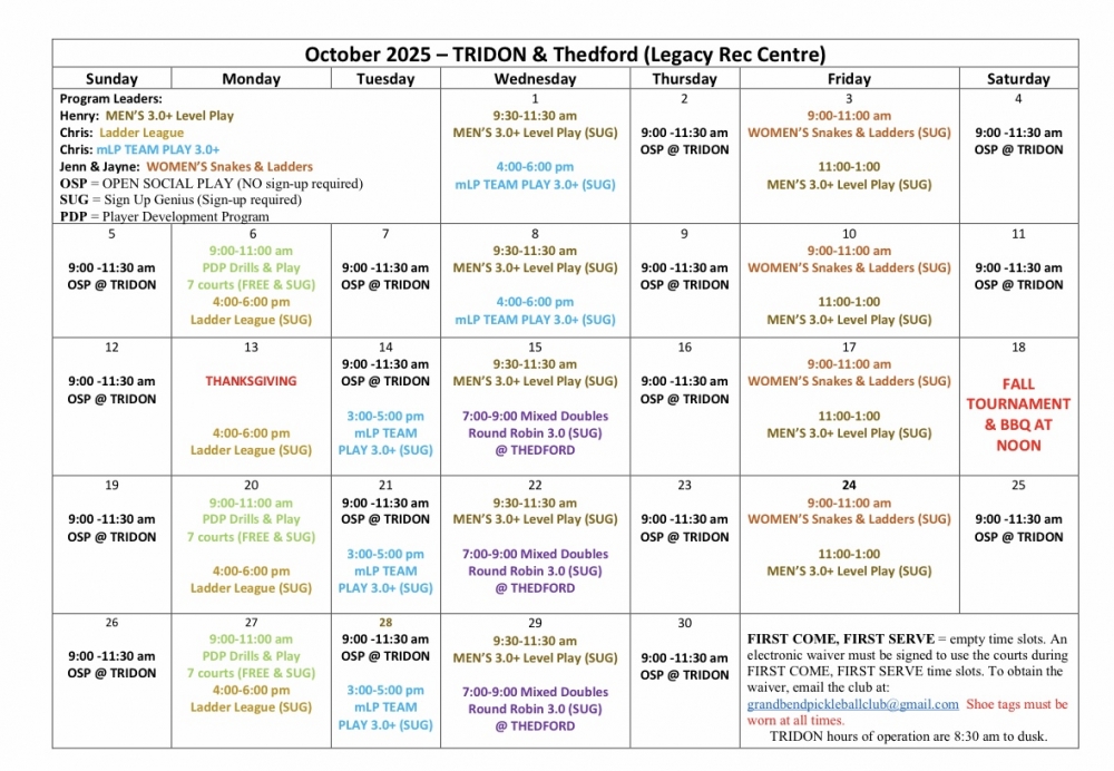 Our programming schedule and a description of the programming being offer this season will be emailed to all club members and posted to our website at https://secure.pickleballcanada.org/club/grand-bend-pickleball-club/35813/. The programming schedule will be gradually implemented. Many volunteers will be needed to convene court times. If you are interested in hosting a particular program or timeslot please contact Chris Holder on WhatsApp.