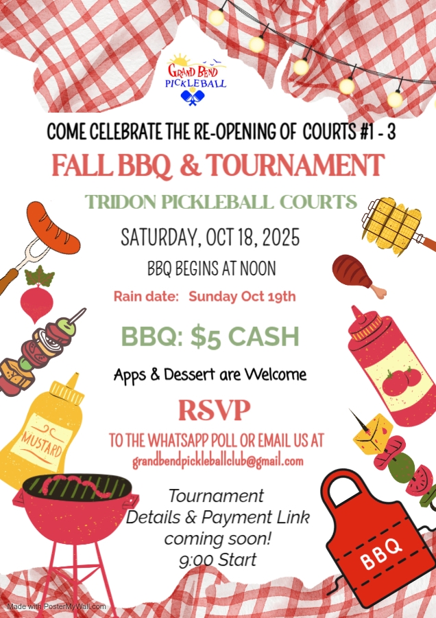 - On Saturday May 4th at noon, we will be having a BBQ at the TRIDON Pickleball Courts (weather permitting). Please bring a bit of cash to pay for your lunch. Many thanks to Lance and Carol Anne for donating a BBQ to the club!