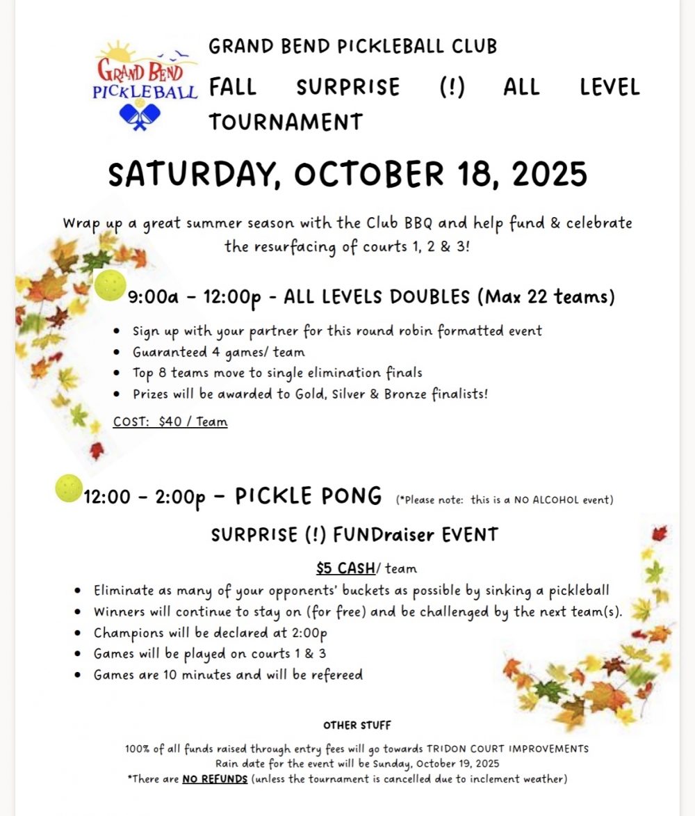 Since there are sufficient left-over materials and previously approved funds to complete the next phase of TRIDON Court resurfacing, the Grand Bend Pickleball Club is happy to share the news that Phase 2 of TRIDON Court re-surfacing is approved to begin Monday, September 15, 2025. Phase 2 includes the resurfacing of Courts #2 and #3. Subsequently, beginning on Monday, Courts #2 and #3 will be closed until the re-surfacing is completed.