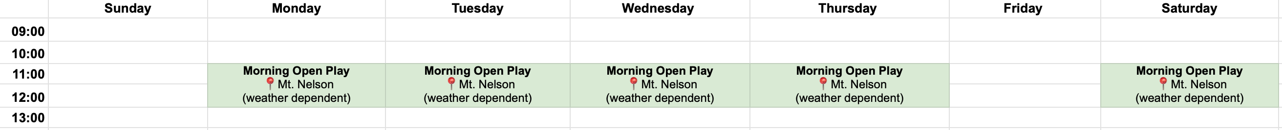 Our current play schedule is also posted on our Facebook page and Sign Up Genius (SUG). The schedule may change depending on weather and/or not enough players. Hosts also use the comment section of each session to indicate if play is moving indoors due to weather or if the session is canceled.