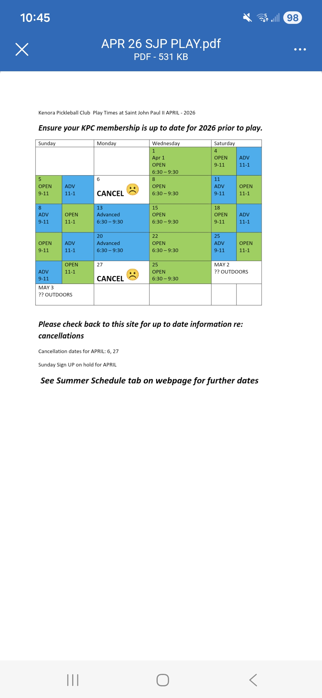 Sunday register for play each week by 5pm Saturday prior at kpcsundaysignup@gmail.com