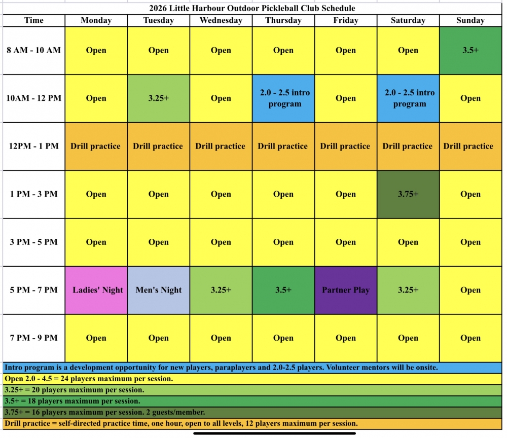 For scheduling and other useful information about the Little Harbour Pickleball Club please visit the Little Harbour Community Centre’s Website at https://littleharbourns.com/li... and click on the “Pickleball” tab at the top of the page OR visit our Facebook Group page @ Little Harbour Pickleball (link: https://m.facebook.com/groups/...).