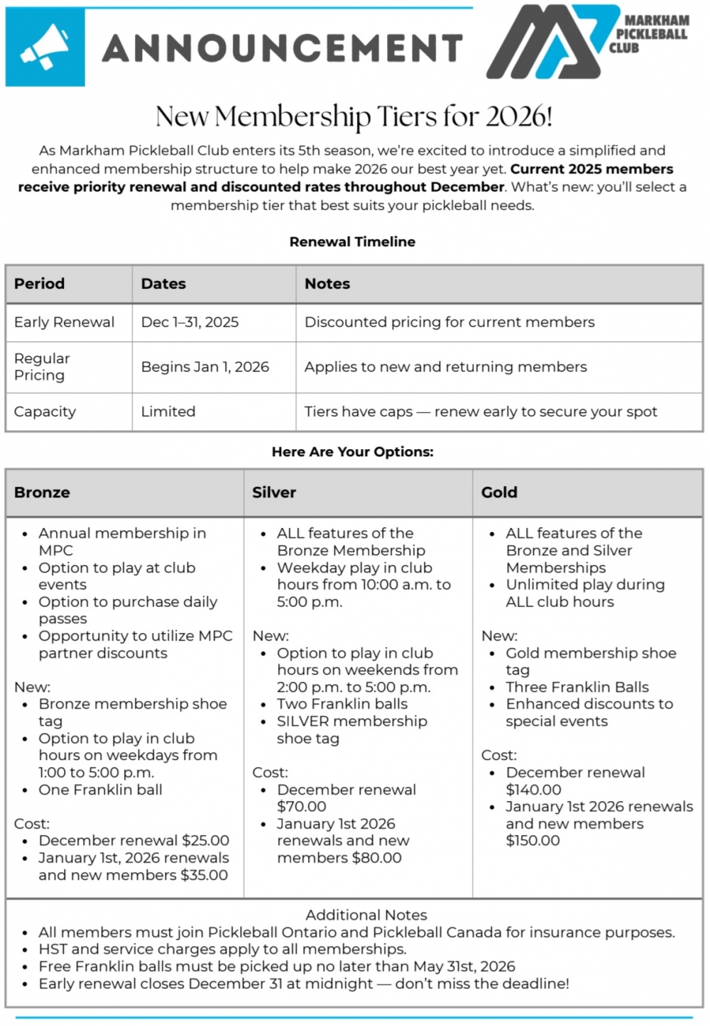 For more information and/or questions, email info@markhampickleballclub.ca.