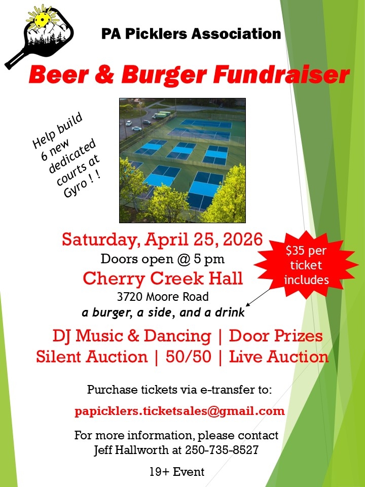 Join us for a Beer & Burger Night on April 25th and help push Port Alberni pickleball into its next chapter. We’re down to the final 30% of monies required to build 6 new dedicated courts. Your presence at this event is the strongest way to show that our club is ready to make it happen. This is our moment to demonstrate commitment, unity, and passion for the sport we love. The future of pickleball in Port Alberni is NOW, so let’s seize it together! Here’s how:
