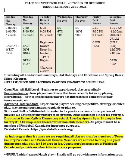 Anyone wishing to play should follow the Peace Country Pickleball Facebook Group page for up to date schedule changes and club news. Players can also message a club member and request to be included in the club Messenger group.