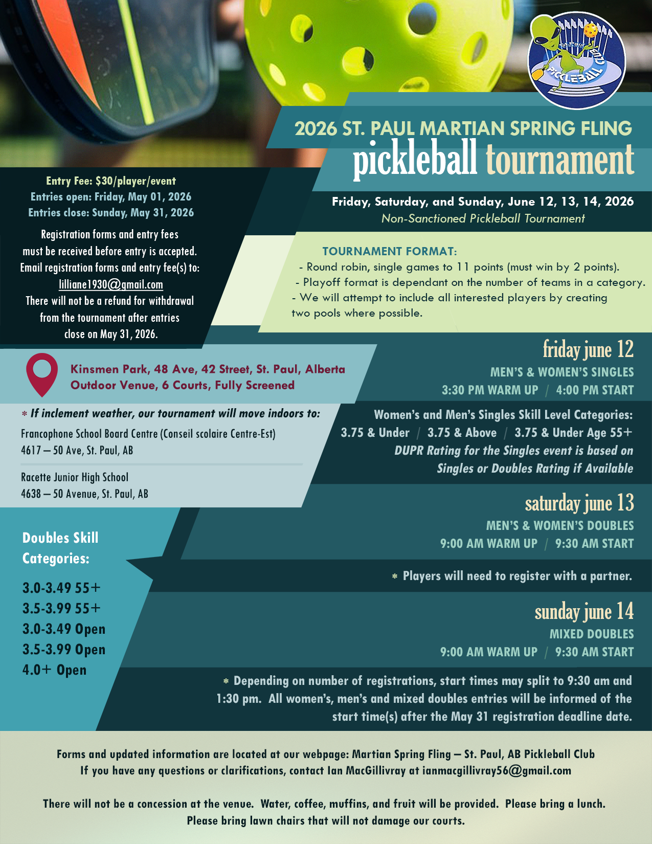Our tournament is being hosted June 12 (singles), June 13 (men's and women's doubles), and June 14 (mixed doubles). We have also made some changes to the categories you are able to play in. Singles: <3.75(singles or doubles DUPR) 55+, <3.75 (singles or doubles DUPR) open, and >3.75 openDoubles: 3.0 - 3.49 (55+), 3.0 - 3.49 (open), 3.5 - 3.99 (55+), 3.5 - 3.99 (open), 4.0+ (open)