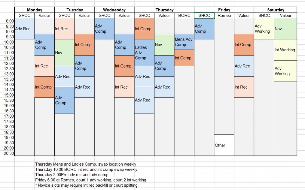 Novice, Intermediate Recreation, Intermediate Competitive, Advanced Recreation, Advanced Competitive, , Men's and Ladies advanced competitive.