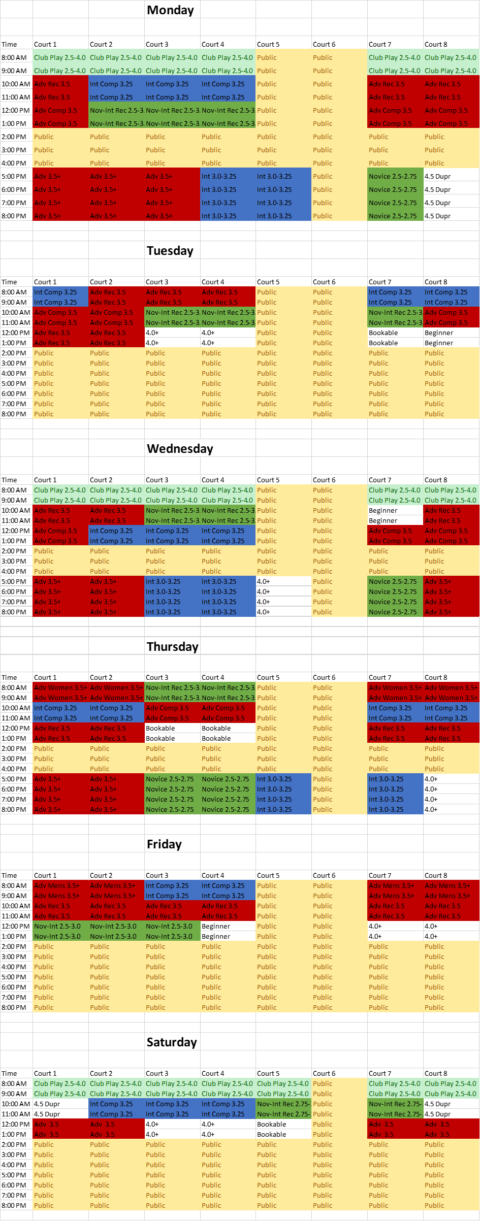 (example: on Mondays 8AM-2PM C6-P2 means six courts for club play and two courts for general public play)