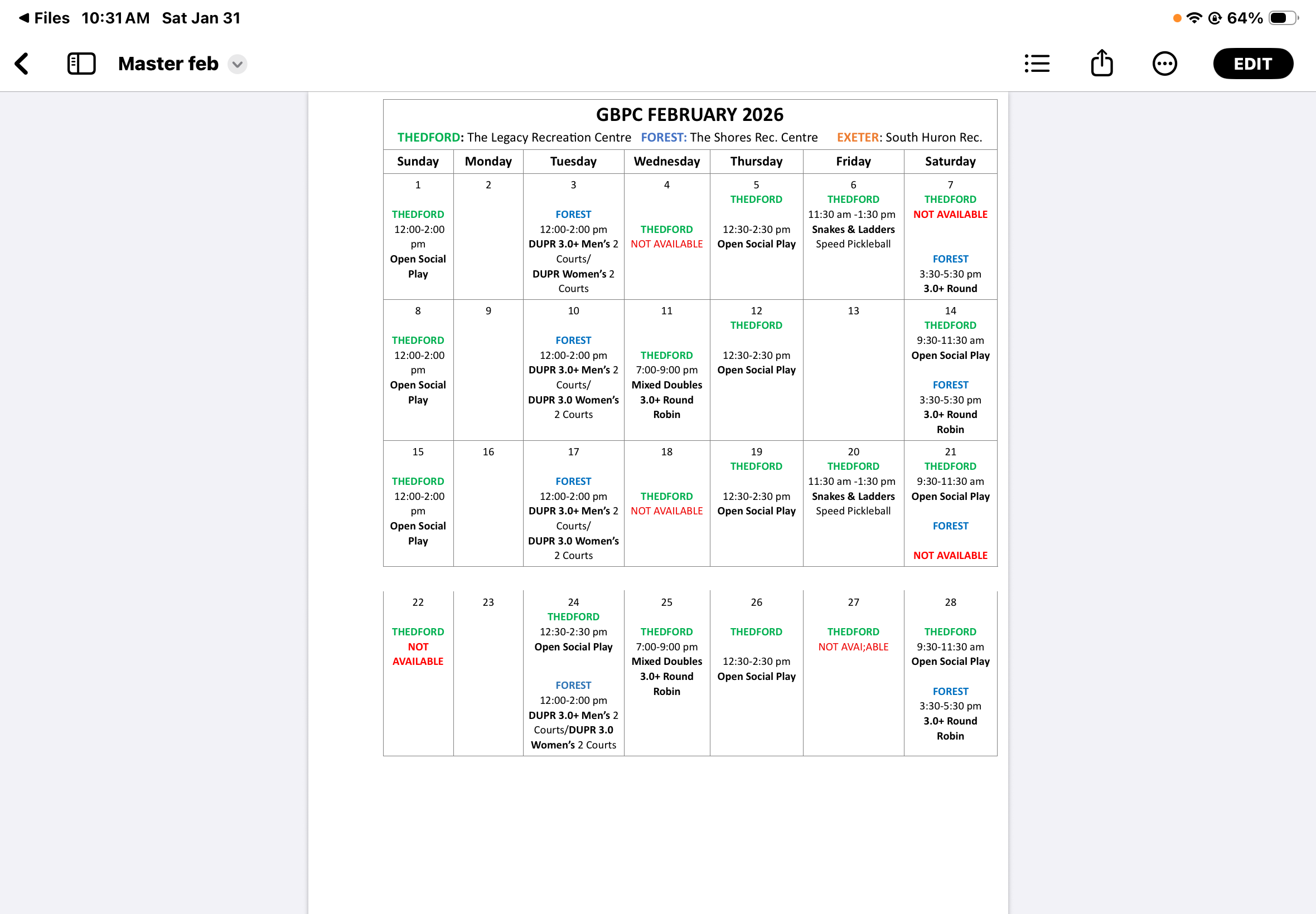 Our programming schedule and a description of the programming being offer this season will be emailed to all club members and posted to our website at https://secure.pickleballcanada.org/club/grand-bend-pickleball-club/35813/. The programming schedule will be gradually implemented. Many volunteers will be needed to convene court times. If you are interested in hosting a particular program or timeslot please contact Chris Holder on WhatsApp.