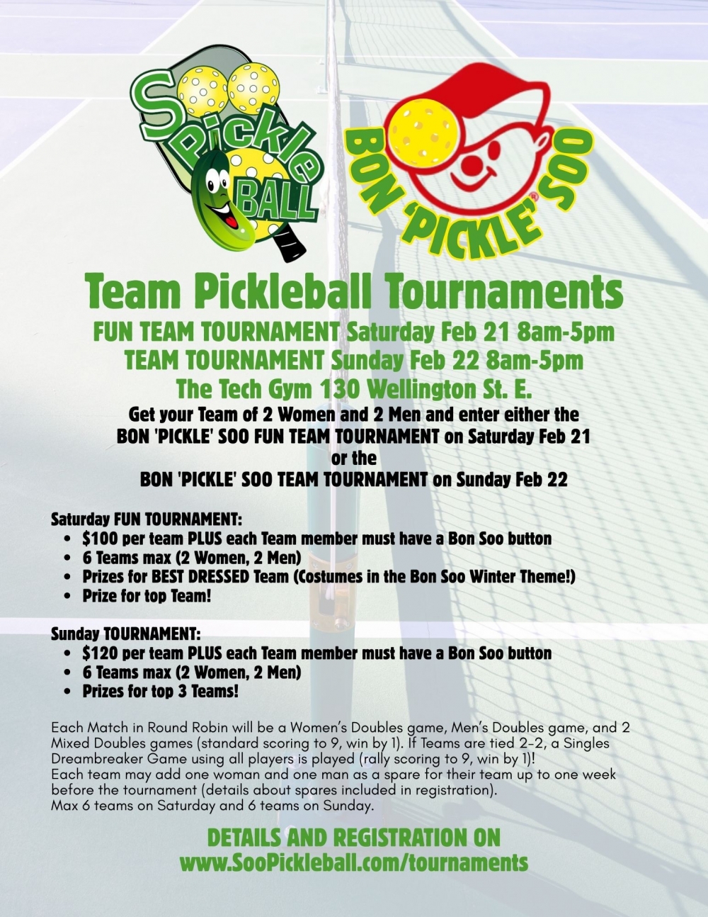As part of the BON SOO activities in Sault Ste. Marie, SOO PICKLEBALL is excited to offer 2 different TEAM TOURNAMENTS!