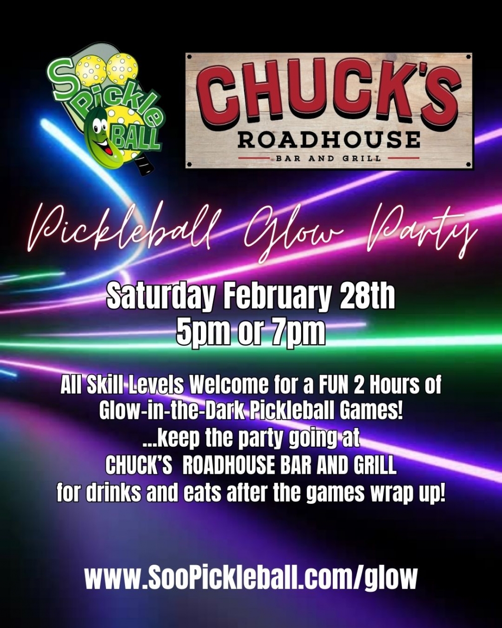 When the games wrap up, keep the party going at Chuckβs Roadhouse Bar & Grill for drinks and eats with your fellow glow legends.