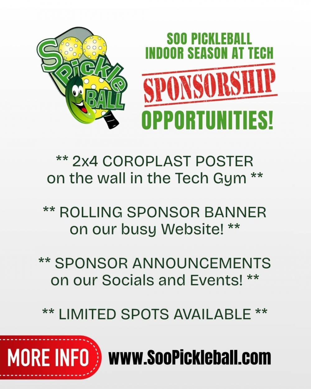 Your Business will be prominently displayed in the Tech Gym for the Indoor Season (Oct-Apr) on a 4'x2' coroplast board, and we will add you to our rolling sponsor banner on our very busy website at www.soopickleball.com. Soo Pickleball will also mention our sponsors during special events and on our socials.