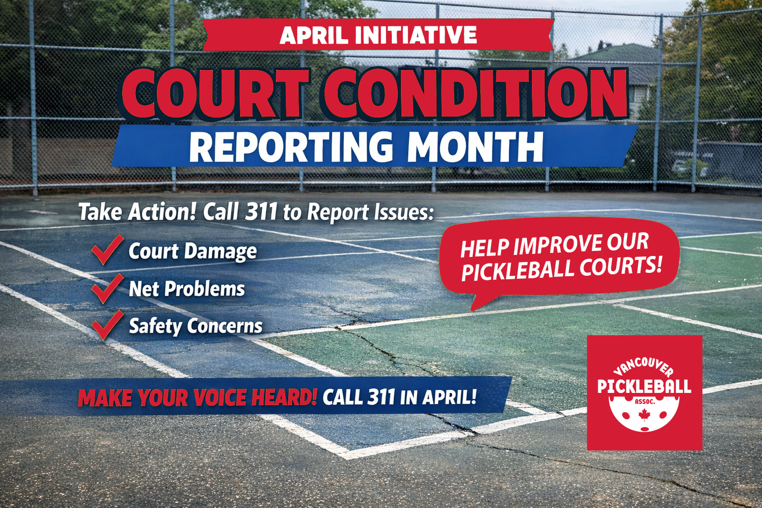 VPA MORE Initiative: VAN311 Court Condition Report. Members and pickleball players are encouraged to file a court condition report with the City of Vancouver via their system VAN311. VAN311is the city's platform for logging residents concerns, comments and questions. Let's make our concerns known in April. More Courts. More Play, More Community.