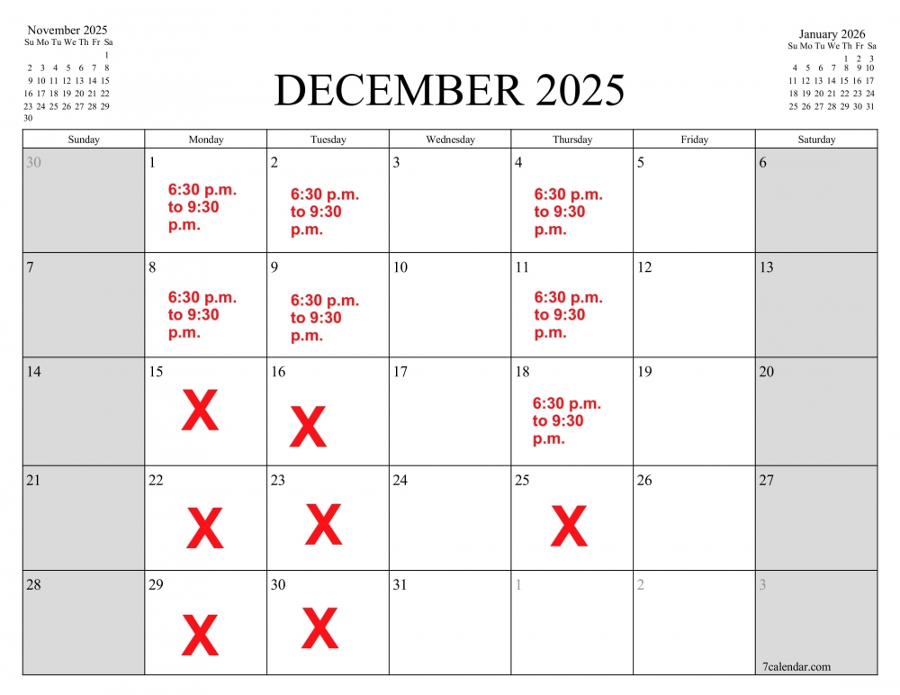 We are playing on Mondays, Tuesdays and Thursdays this year due to school use bookings from other groups.