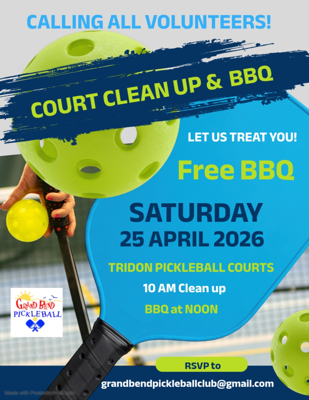 - On Saturday May 4th at noon, we will be having a BBQ at the TRIDON Pickleball Courts (weather permitting). Please bring a bit of cash to pay for your lunch. Many thanks to Lance and Carol Anne for donating a BBQ to the club!
