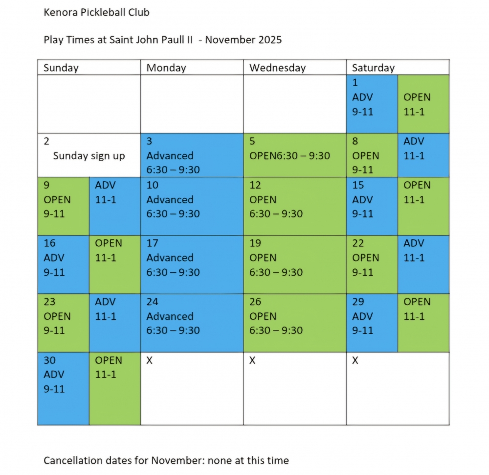 Sunday 1 to 3 pm learn to play from October 26 until November 30. Attendance for new players is required to join in for indoor play for the winter. To register email info@kenorapickleball.ca