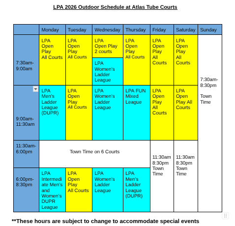 - LPA members have dedicated hours at ATRC outdoor courts from May 1 - October 1/2026 - schedule TBD