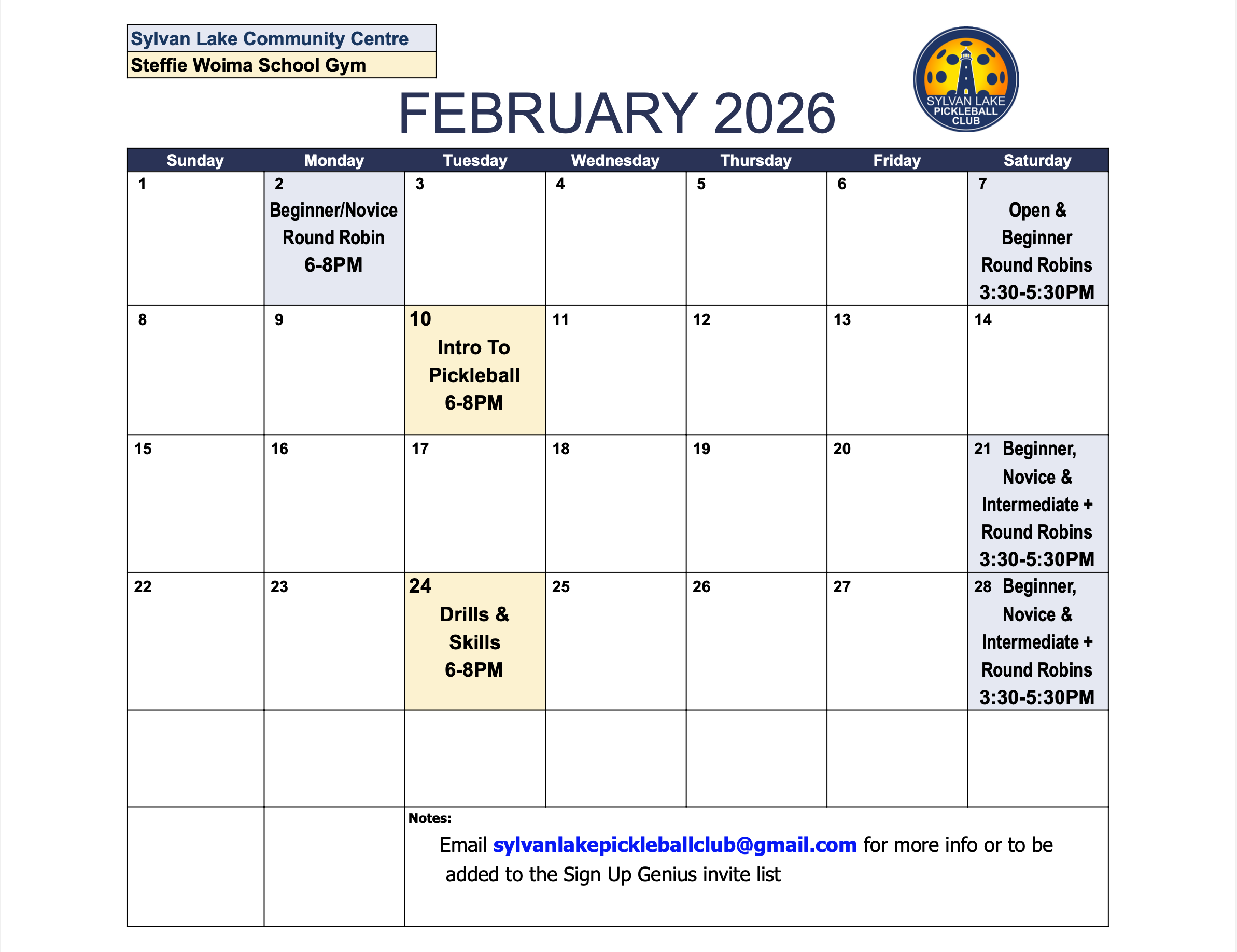 The Sylvan Lake Pickleball Club is excited to welcome you to a variety of organized play. We run Intro To Pickleball sessions, Drills & Skills, Beginner/Novice/Intermediate Round Robins, as well as Open Round Robins.