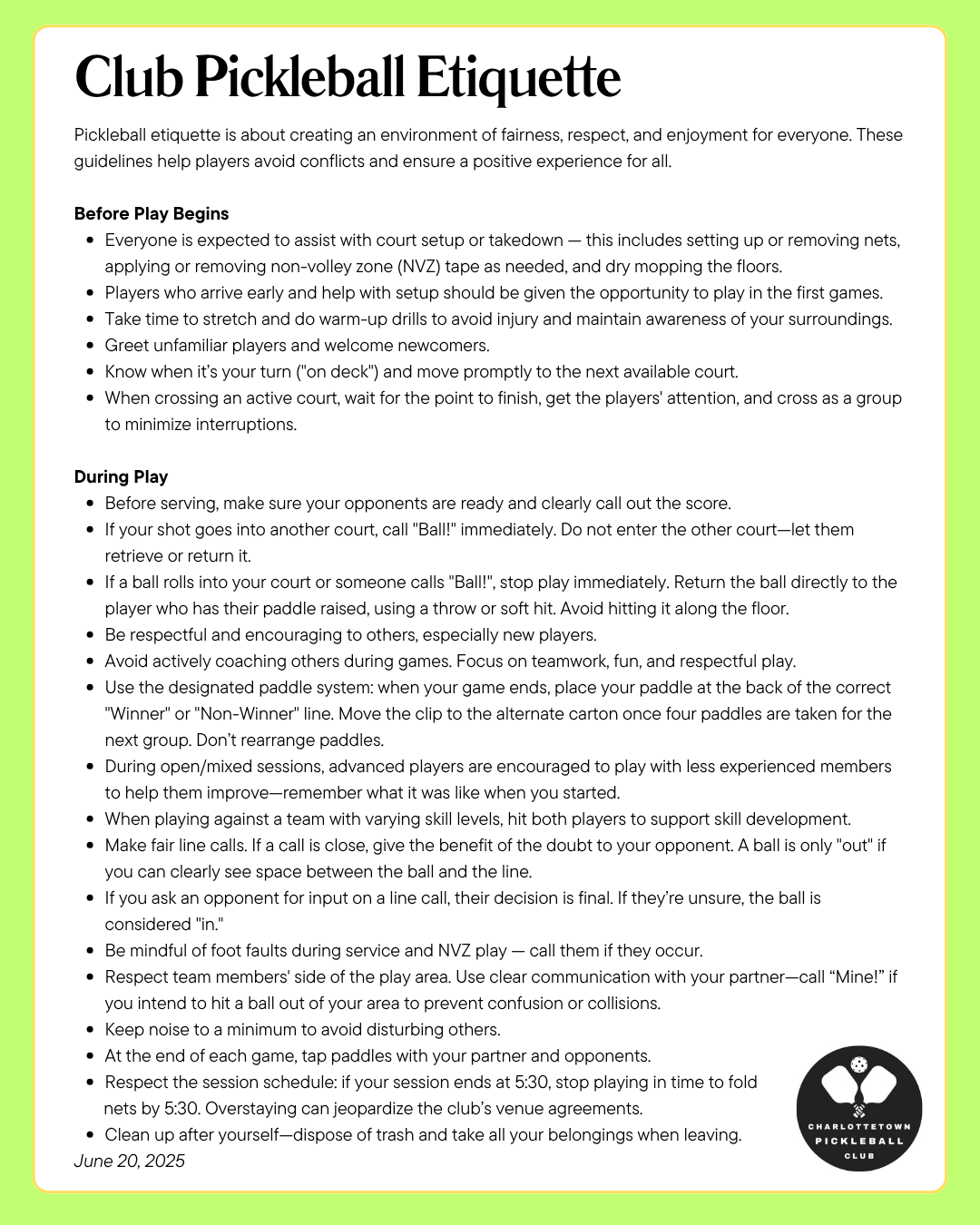 Charlottetown Pickleball Club operates using the Pickleball Canada By-Laws.