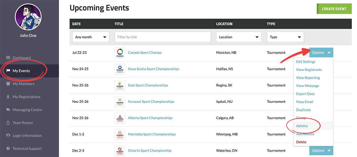 Go to either the My Events or My Members section. From there, click on the "Options" button, and then select the "Admins" option.